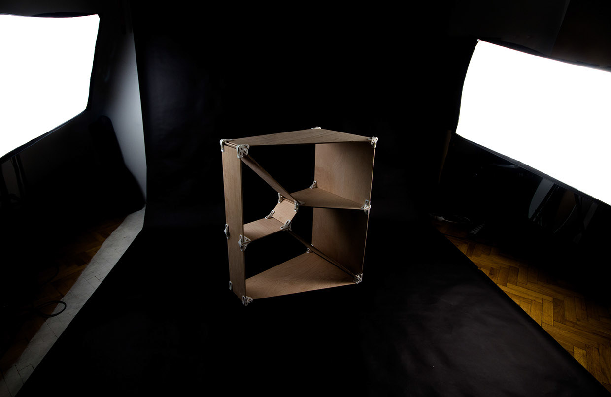 Very interesting exploration of design, but not something I would use in real life. This shelf would collapse rather rapidly as it is a very weak structure. You might be able to put some books and a vase in it, but not much more.