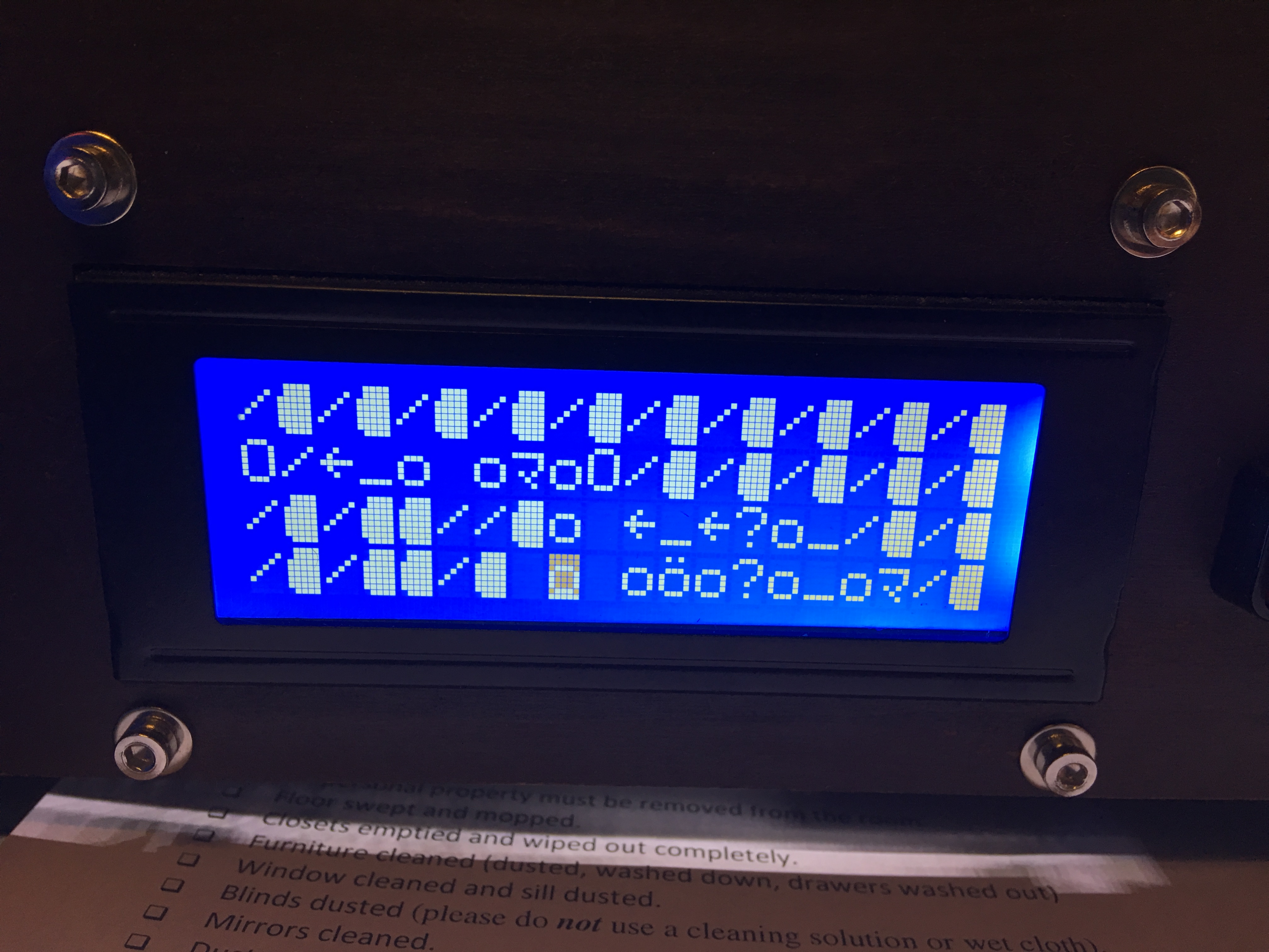 I am an current engineering student and for our freshman project we build a 3D printer. Specifically a CTC Bizer. For about a semester it worked perfectly. I would tune it here and there and got some really quality prints out of it. Towards the end of the semester both of my thermocouples went out at the same time so I replaced them with spares the school had. Around this time I also experimented with different extruded fan mounts but have since gone to the original. Not long after my printer started having some software problems. At first it was only a few here and there but after a while it got increasingly worse particularly after printing almost 100 of the same print. The problem that I am having is that, particularly at the beginning of prints, the printer will either stop printing, grind back to the starting position, completely restart, lightly tick once, or just grind over to a new position and continue printing. All of these are accompanied with the screen glitching in and displaying random characters. (see the picture) I asked my instructor about possible fixes and he said that Ferite rings might be a possible fix. I have since purchased some but the problem still remains. Has anyone heard of or felt with this before? I honestly have no idea what to do.