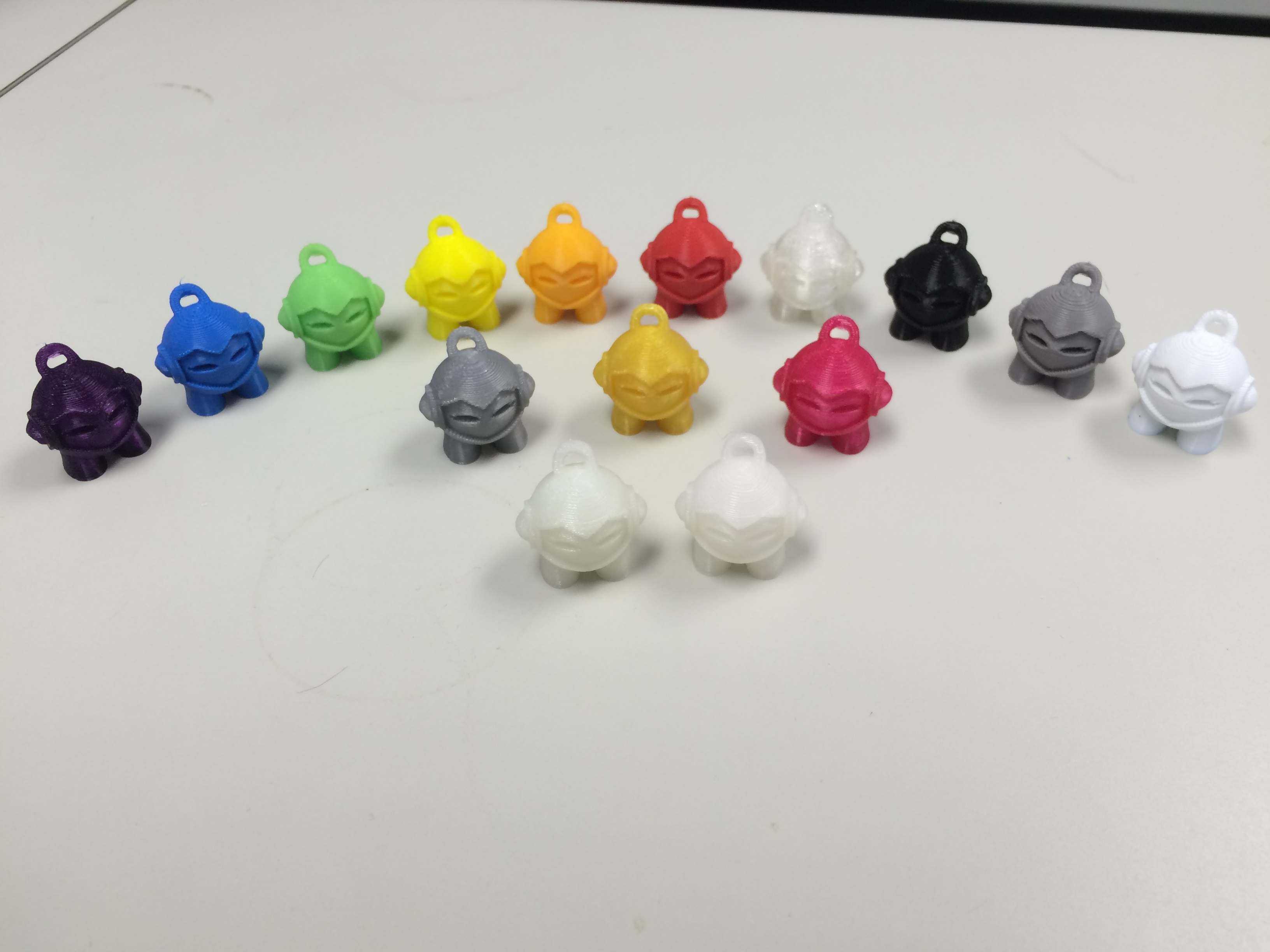 this was done on my Rep 2 at the course setting (0.3mm, 6% infill, 2 shells, varying temp depending on material used) and at the fastest rate. Each took just under 10 minutes. Shown are mostly PLA, a couple of PET-G, color changing with UV and Temp as well as a glow in the dark. Just finished one in copper that was not in the pic. The Marvin is a good way to test print settings, especially where the body meets the legs/feet, if your temps are too hot, you will get droops there, also strings at the top.