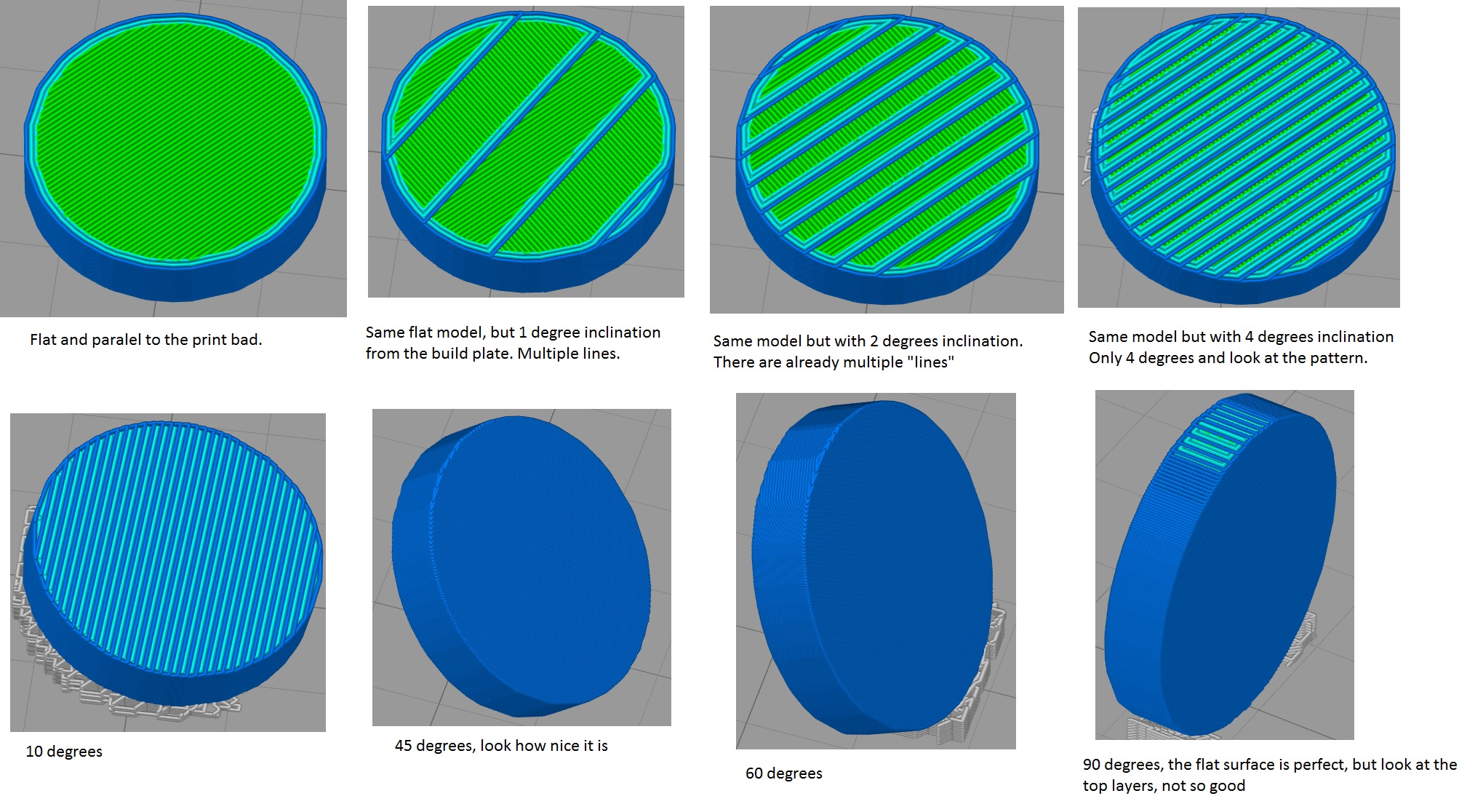 Se my pictures from slicer program, with a flat surface printed in diffrent positions. Note how the lines start to appear after an angle of only 1 degrees. Note also that on 90 degrees the big flat area is at it’s best, but the side is not so good. There is this technique that you use a big angle (but not 90 degrees) to have a very good finish on the surface that you are interested, yet still a quite good finish on the other surfaces, this corresponds to the 60 degrees angle from my pictures.