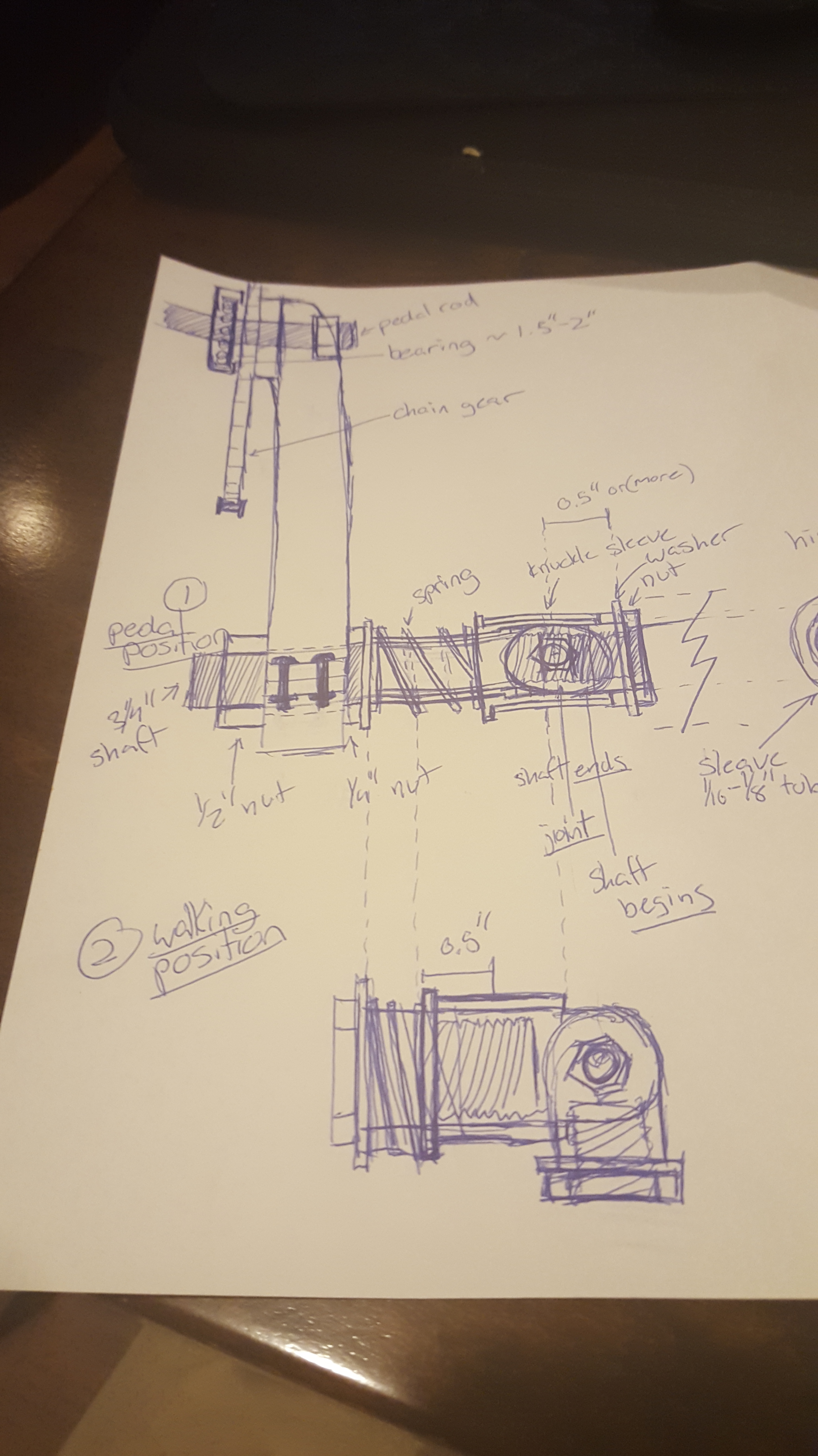 I sketched what I think it should look like today at starbucks. I love drawing. It gave me time to think about the mechanism. I think the assembly should be shrouded in the pedal arm for support since a lot of pressure is consumed by the attachment area between pedal and arm. Plastic probably is not the best material but for prototyping the mechanical properties, it is ideal, 3d printing. The new child bicycle build looks nice. I like the belt chain drive. Kids need a new bicycle every few years it seems to me. A great opportunity for rapid manufacturing.