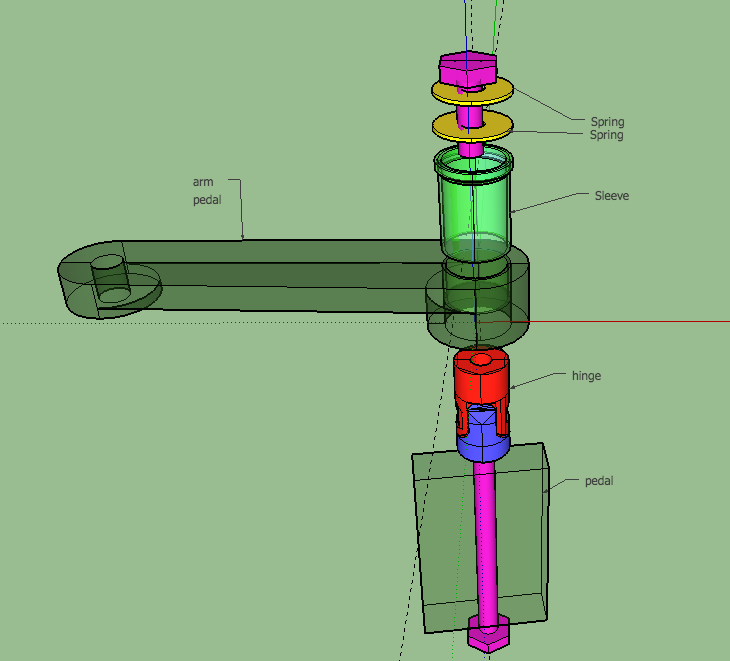 I think it would look like a cylinder pivot inside a sleeve. To fold, the pedal joint would pull out of the sleeve and fold down. The joint the is held in by a spring.