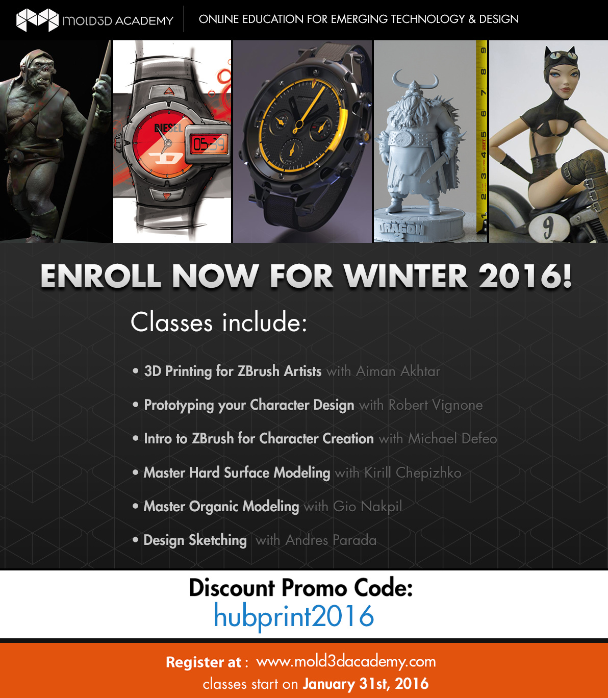 We just opened up registration for Winter 2016 classes. We are also offering 3D Hub members a $50 off regular price discount code: