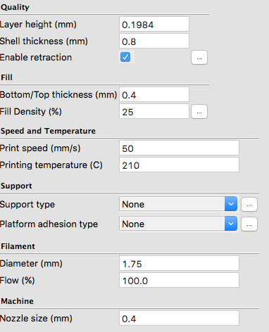 I have attached a PDF of an example GCODE file for one of my Marvin’s I pint as keychains. The final print is a 2 perimeter ZERO fill print at 0.1mm layer height. The orange Marvin you saw in my pictures on my hub (and all others I Have successfully printed since) are using this GCODE. You will need to copy and paste it into an empty text file and save it as a .gcode file. Try running that on your Printrbot - it SHOULD work as is, as we have the same model. If you don’t get a good result, try a different filament? Also check out the commented top section which shows most of the basic Cura settings.
