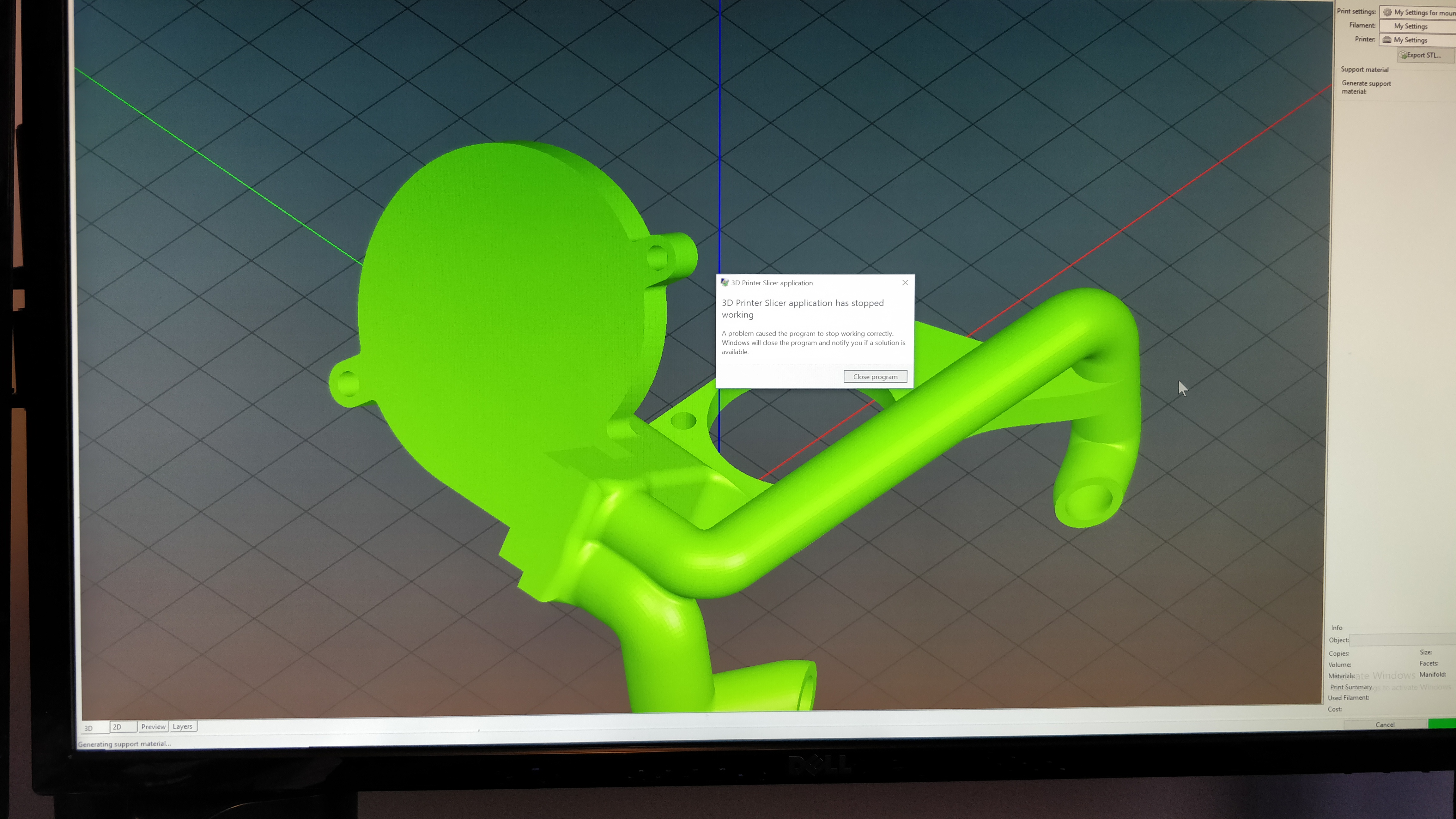 I have been using Slic3r for 6 years now and never had an issue with it crashing. When I try to slice a fan mount for my delta printer, slic3r crashes when it is generating support material. When I looked at the resource usage of my computer while it was slicing and the cpu was at 5%, the gpu was at 0% and the the ram didn’t budge from the usual 9% when not under load. I tried changing the number of cores available but that just changed the amount of time it took to crash. I also tried reducing the resolution of the model and messing with the support settings to no avail. Does anyone know how to fix this issue? My computer has duel xeon E52683 V3s, with 28 hyper threaded cores total, 128gb of ddr4 RAM at 2133Mhz, and an Nvidia gtx1070. It is running Windows 10 Education.