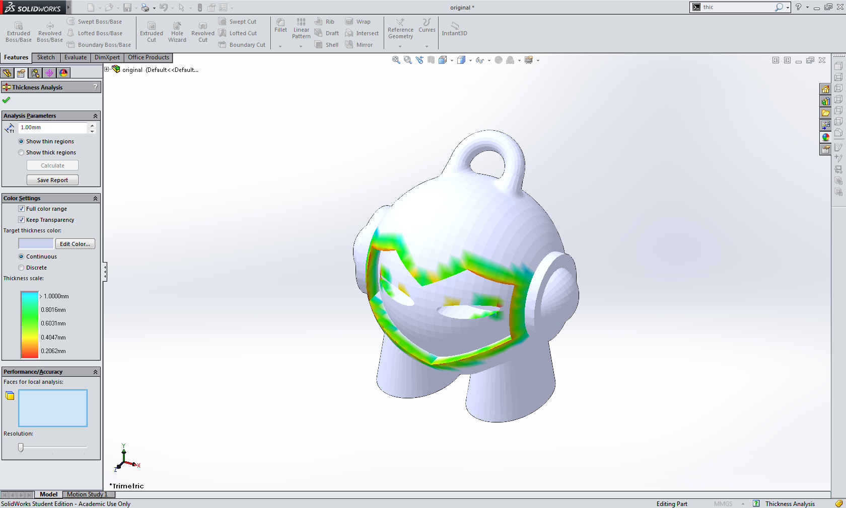 Luckily, the Thickness Analysis utility tool makes it ridiculously easy to to check the size of your walls in SOLIDWORKS. Use the table below for reference: