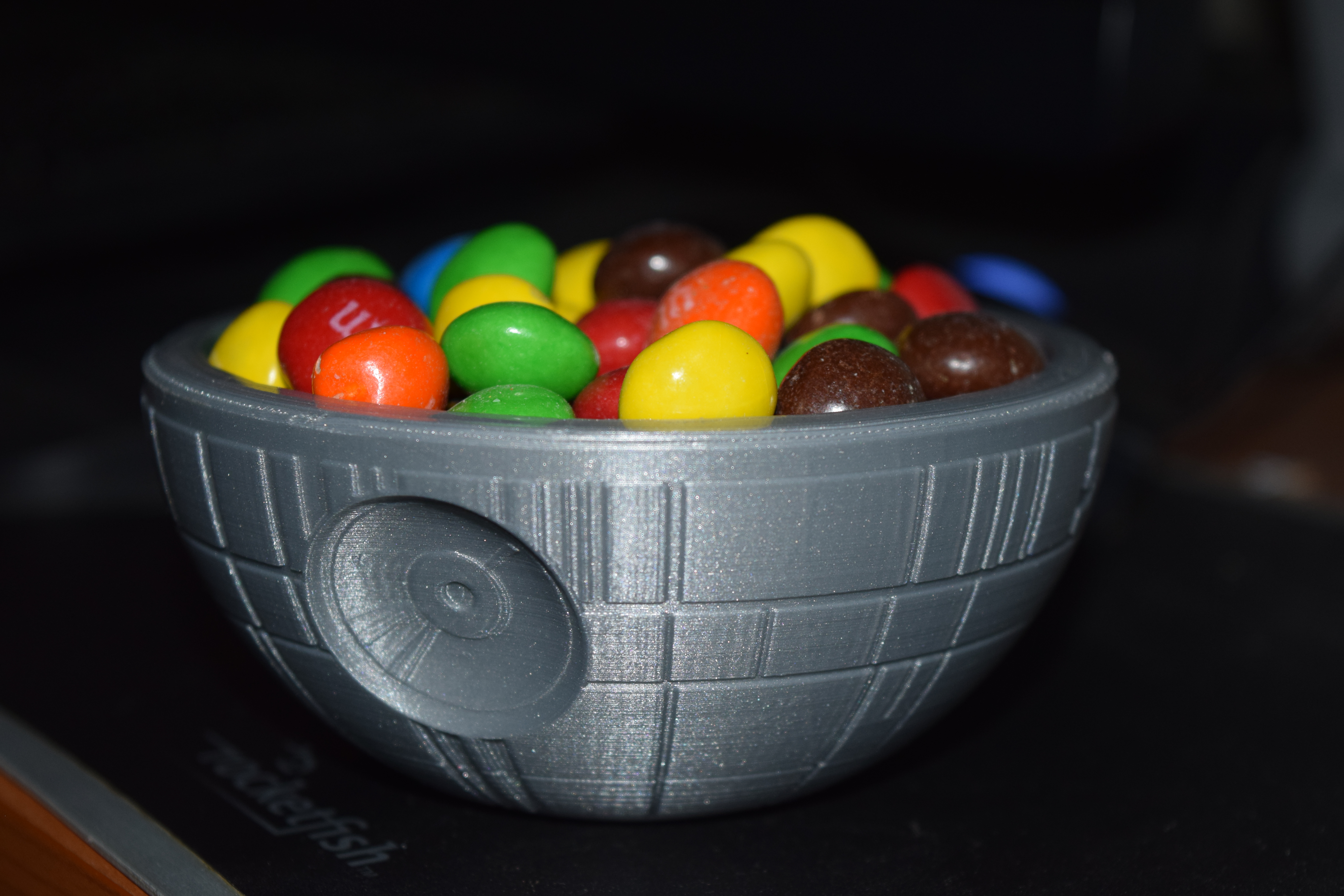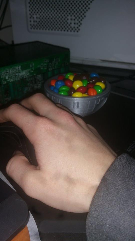 Alright, my print finally finished so I can finally post it! A Death Star snack bowl since it’s easy to print and it seems like an item most people would use. Print for a small movie get together! At the printed size it holds about a 6 oz bag of candy, sits very sturdily with no supports used in Cura.