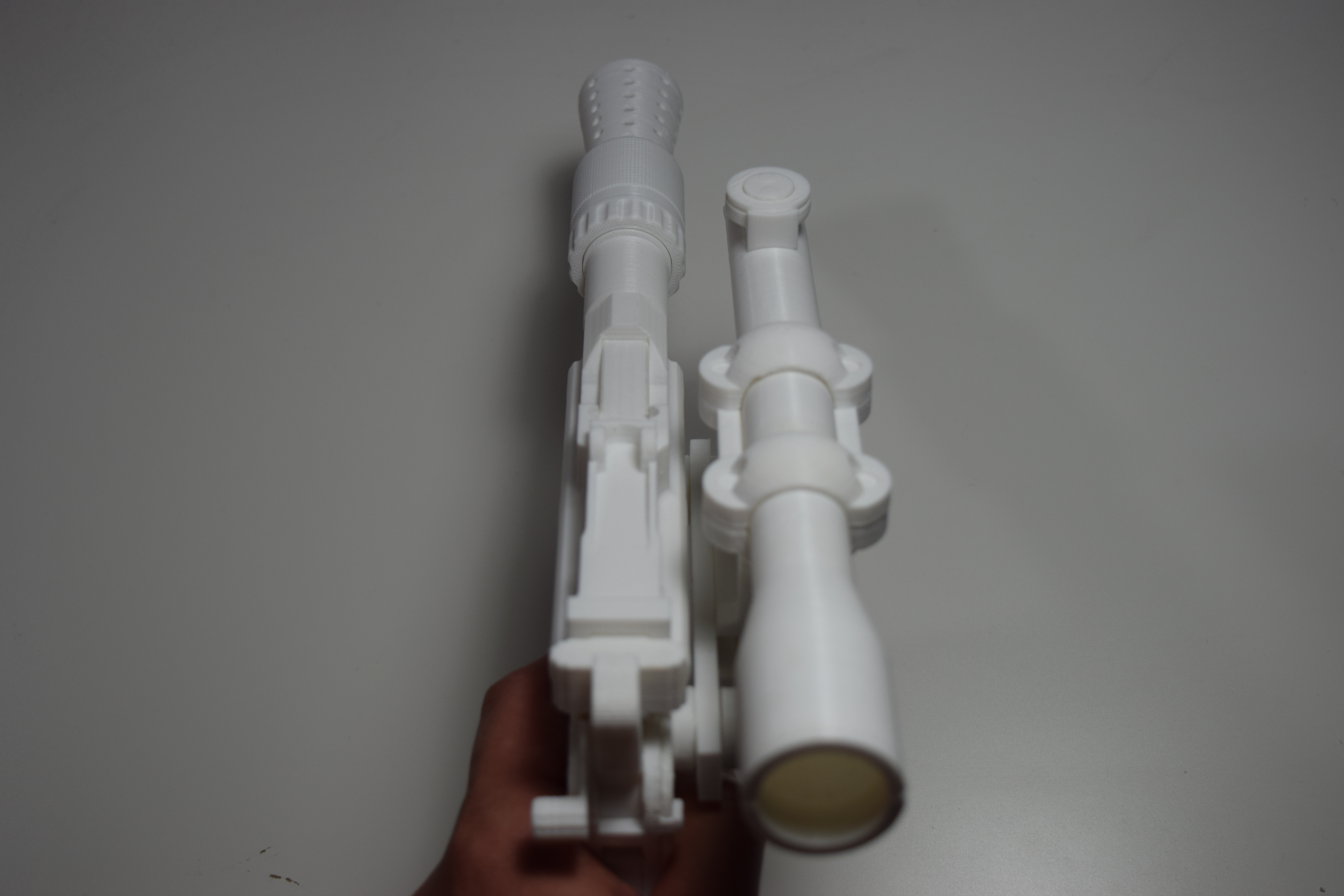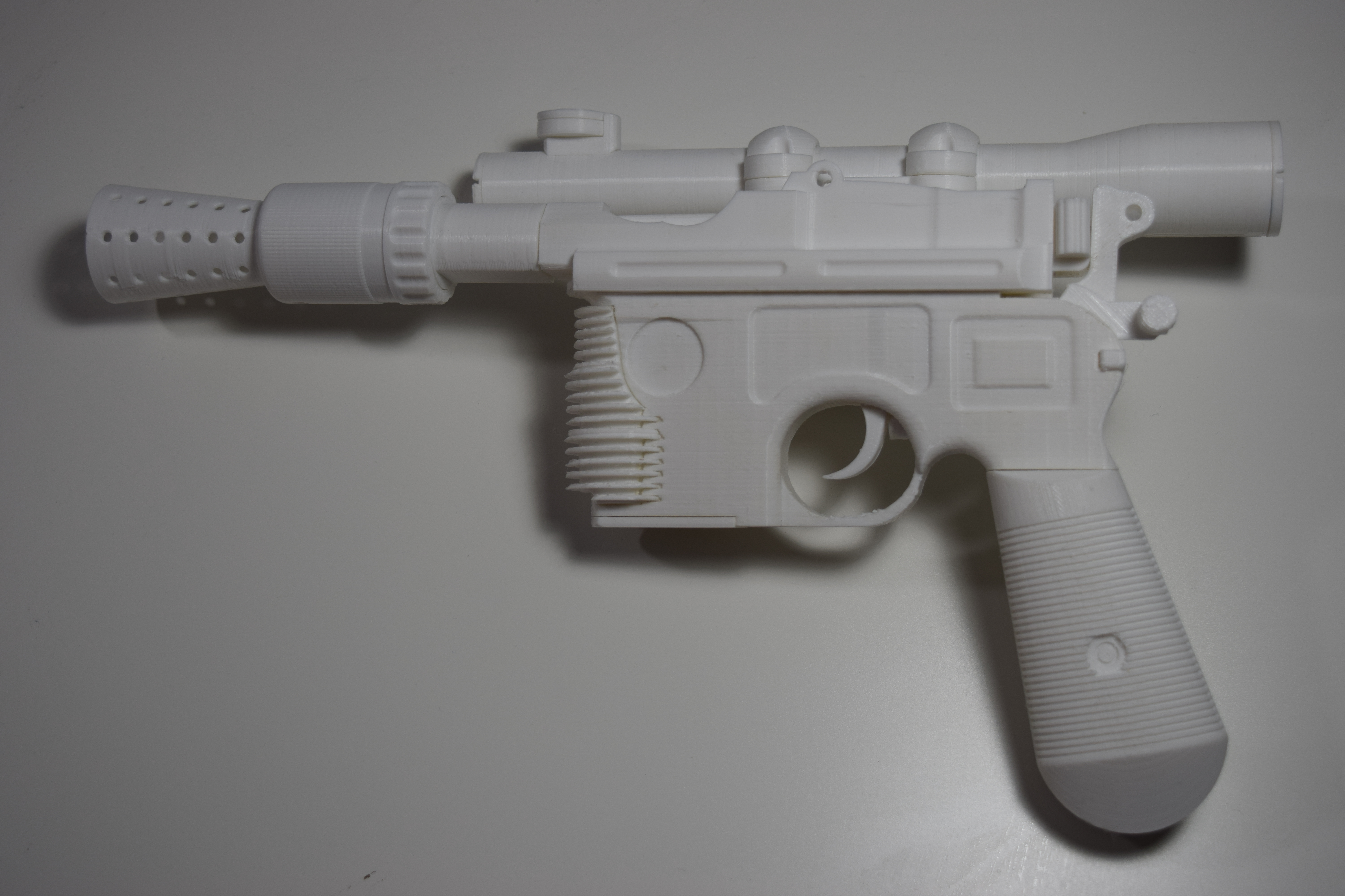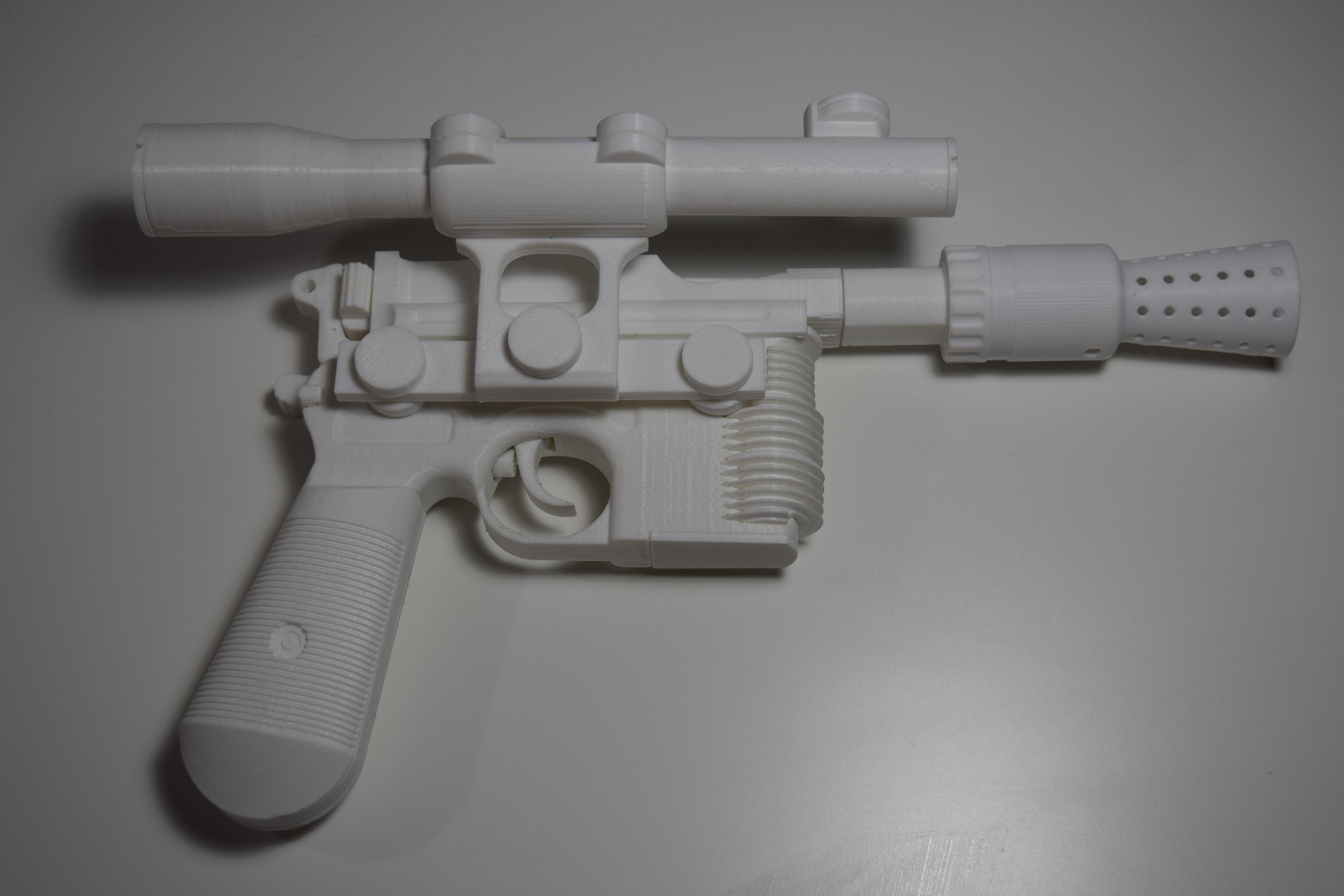 Every smuggler’s trusty sidearm! I poured hundreds of hours researching screengrabs and Lucasfilm archive photos to capture the detail to the best of my ability. My favorite aspects are that the hammer can be rotated back and forth, magazine can be unloaded, a spring can be added to make a functional trigger, and the model is printed in parts to maximize detail and ease of paint. Tech-savvy makers can take advantage of the space in the handgrip, body, and barrel to fit in electronics for light and sound effects. The render shows an ideal paint job, but I only have a raw print at the moment. I hope you have as much fun as I do with this model! The 34 .stl files are available on YouMagine: