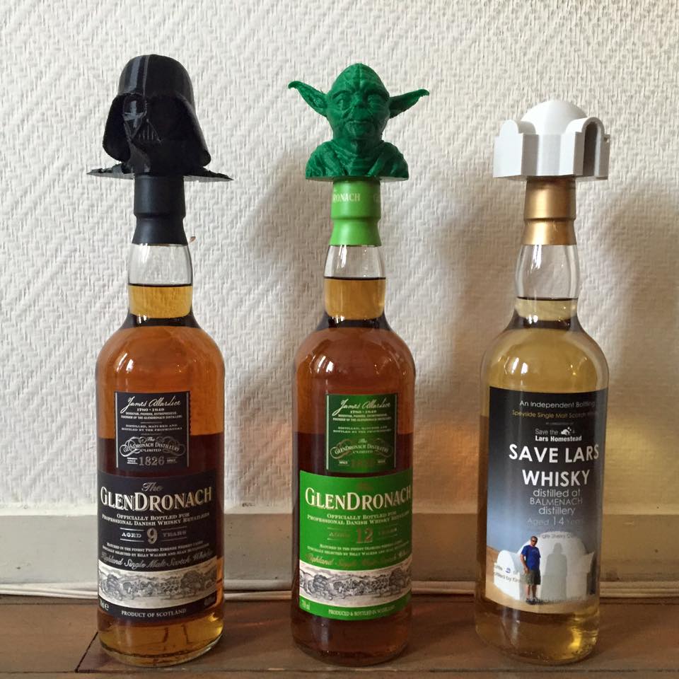 I made Toppers for my whisky bottles (the black bottle has nickname Darth Vader, the green bottle has a nickname Master Yoda and the last one is from the Save Lars Homestead (its a trilogy of whisky)) The Lars Homestead is the first 3d model from this building made from original drawings, darthvader and masteryoda are made before and I made the right fit for these specific bottles.