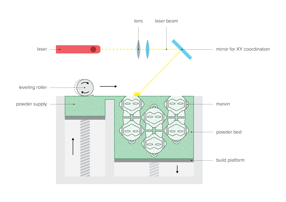 It’s important to note that the whole tray of unsintered powder is already heated until near-fusing temperature, the laser does the last push.