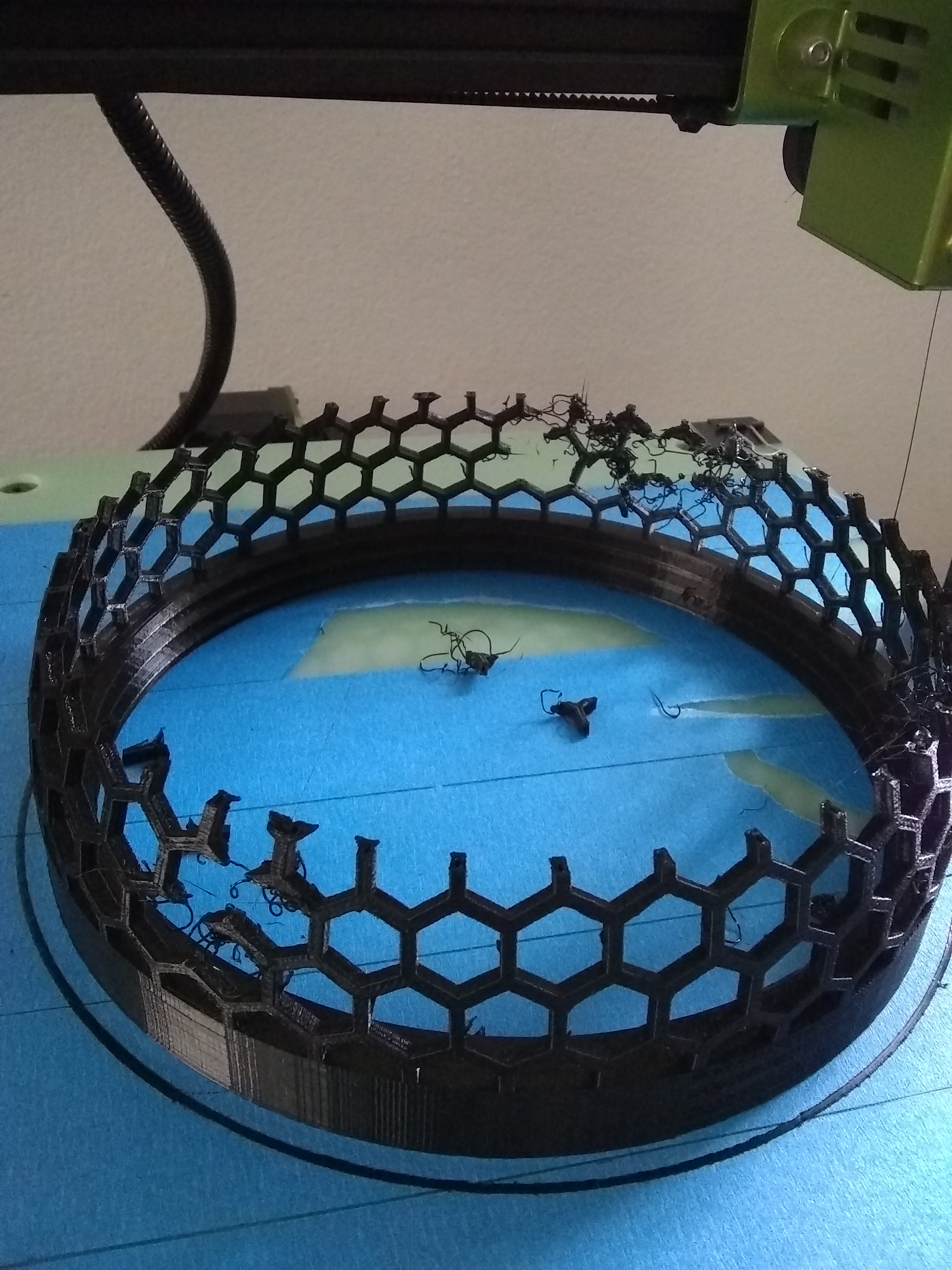 I was in the process of printing a large honeycomb sphere structure, and noticed that it had snapped off in several spots (I assume from the nozzle bumping into curled parts of the print)