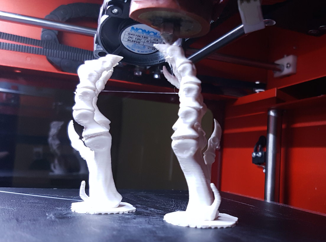 I printed most of the parts at 150 micron in white colorfabb PLA at 20-30 mm/s at 190 degrees (thanks for the temperature advice Ken). The models themselves were modelled and positioned in such a way that I didn’t require any supports which I thought was really nifty and quite impressive! I did print a raft underneath the prints to make sure that they would actually stick to the bed but I’m sure a lot of printers wouldn’t even need this either.