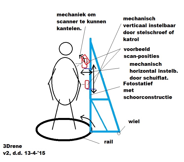 Wanneer het een rechte staander wordt, zoals inderdaad een statief, dan moet ik iets bedenken om de scanner gemakkelijk naar een gewenste afstand tot het lichaam te kunnen schuiven. Het zou dan een horizontaal stangetje kunnen zijn welke je dan kan in- en uitschuiven. Dit laatste heeft niet de voorkeur daar je dan afhankelijk wordt of de bedienende persoon dit handmatig goed doet. Het risico is dat wanneer dit bijv. te snel gaat, er de melding komt ‘lost tracking’ waardoor je vaak opnieuw moet beginnen.