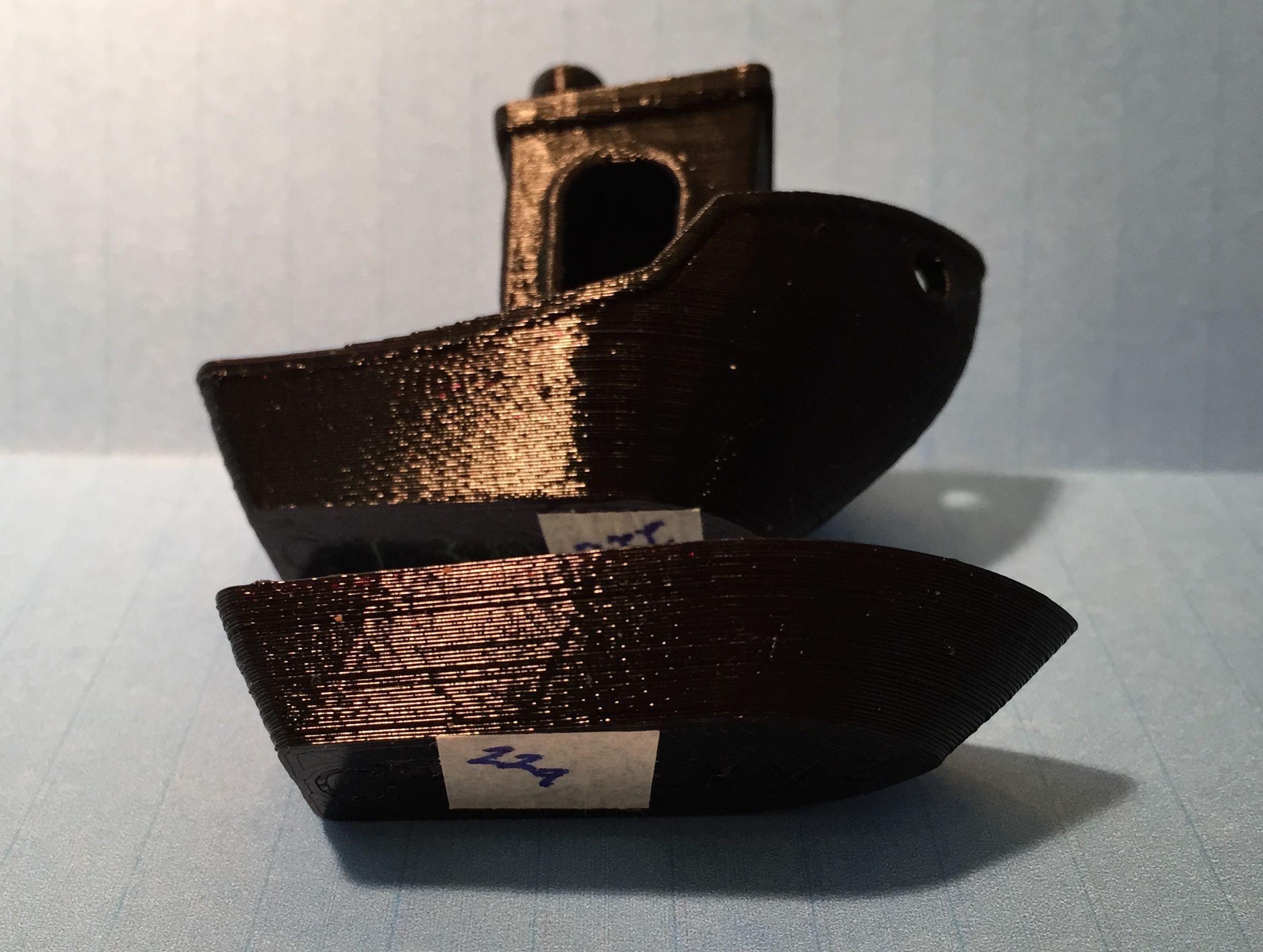 As you state in your instructions, raising the number of shells fixes that problem … that is why I raised my number of shells on test 22 from two to three! Which got rid of that artifact but not the zebra stripes on the cabin which you can see in my print and I think I can make out in yours though I am not sure…