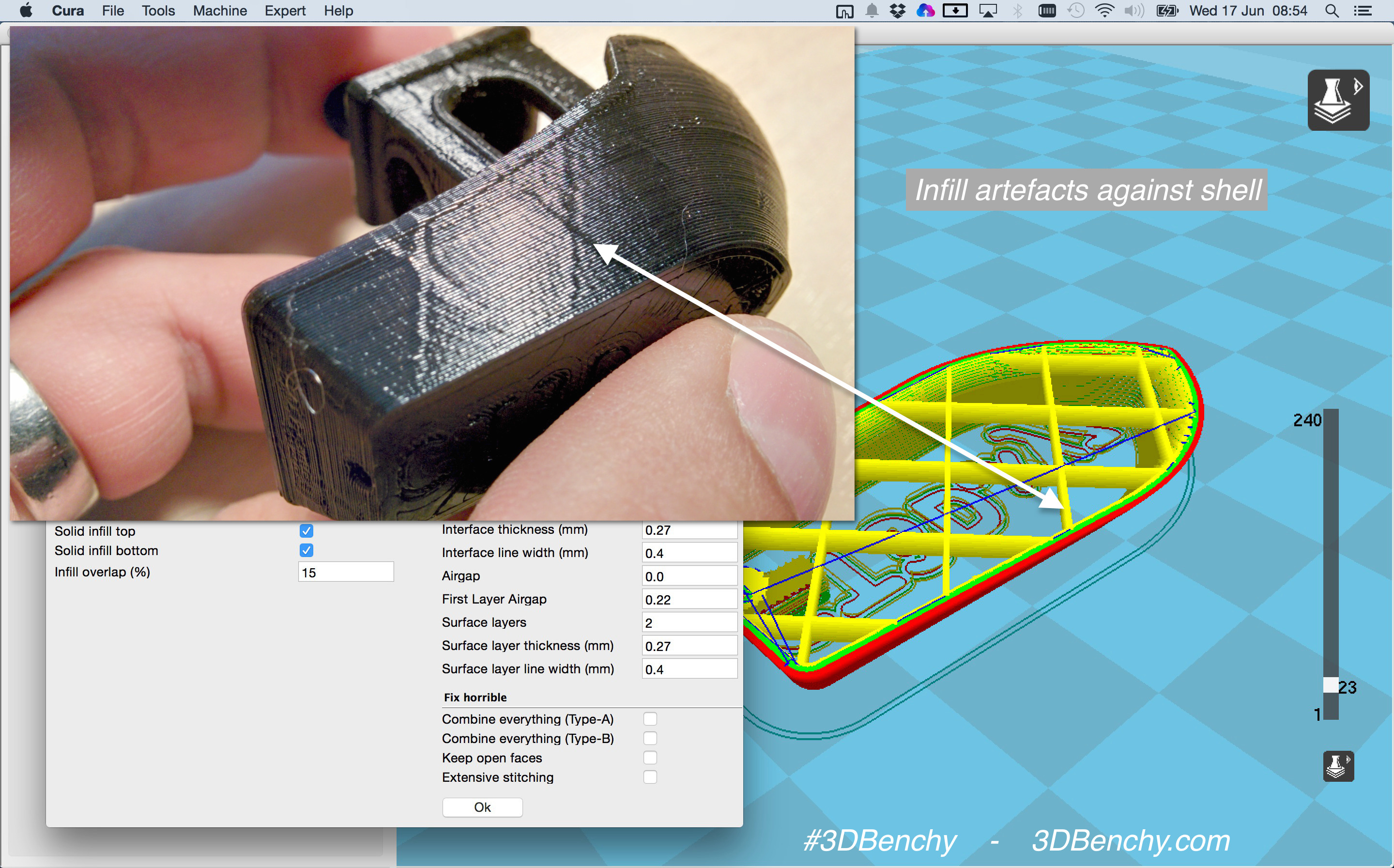 There is a thread on this topic on the Ultimaker forums but if someone here could print this thing and post the result it would be appreciated! I would note that at least one other person gets the exact same result on their Ultimaker and that I have tried everything to get rid of the artifact. A super high infill seems to do it as does rotating the object by 45 degrees. Both of these actions, however, have negative impacts on other aspects of the challenge!