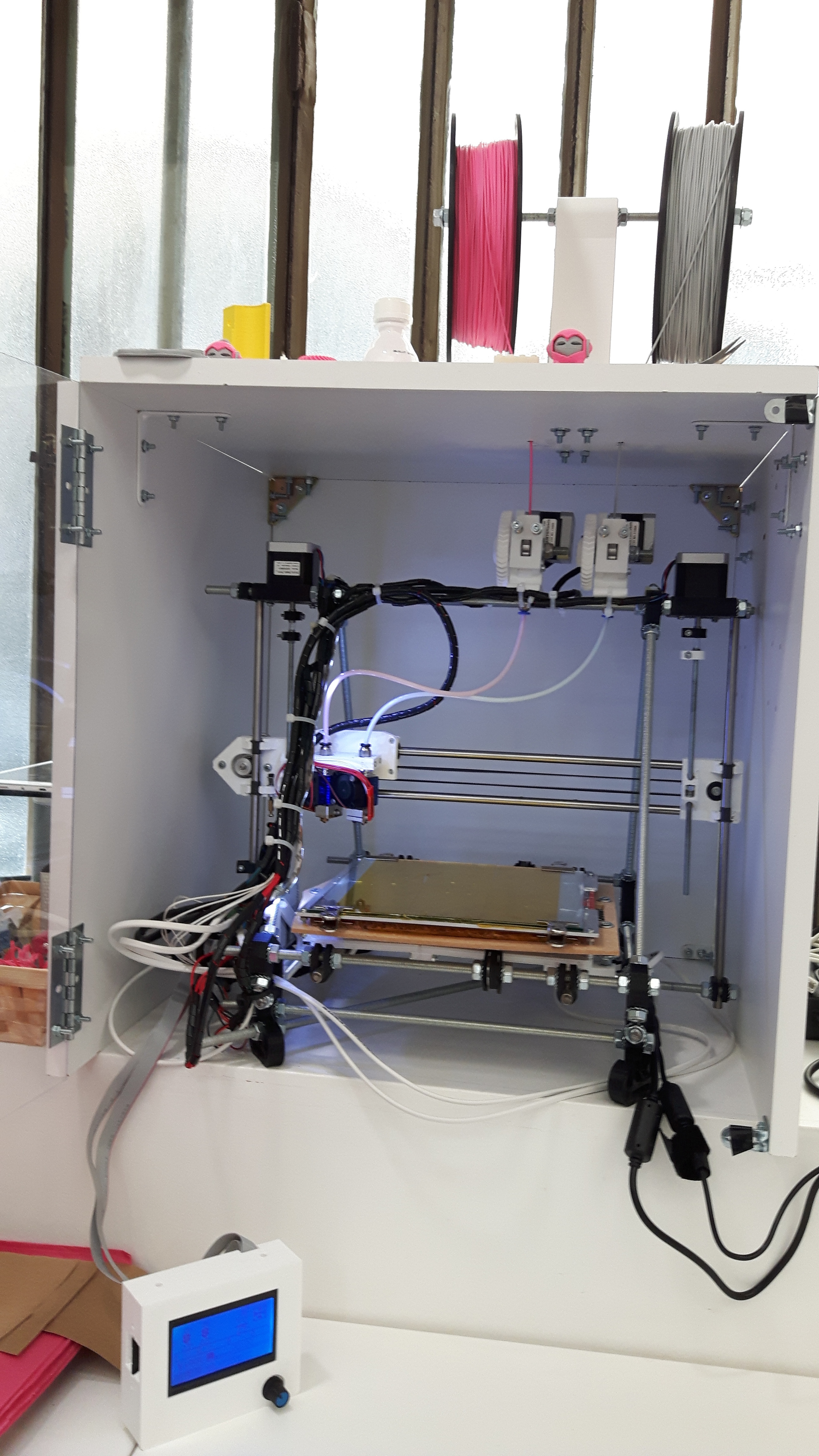 . Imprimante fournie avec une enclosure en bois supportant les deux bobines de filament et permettant de réguler la température d’impression.