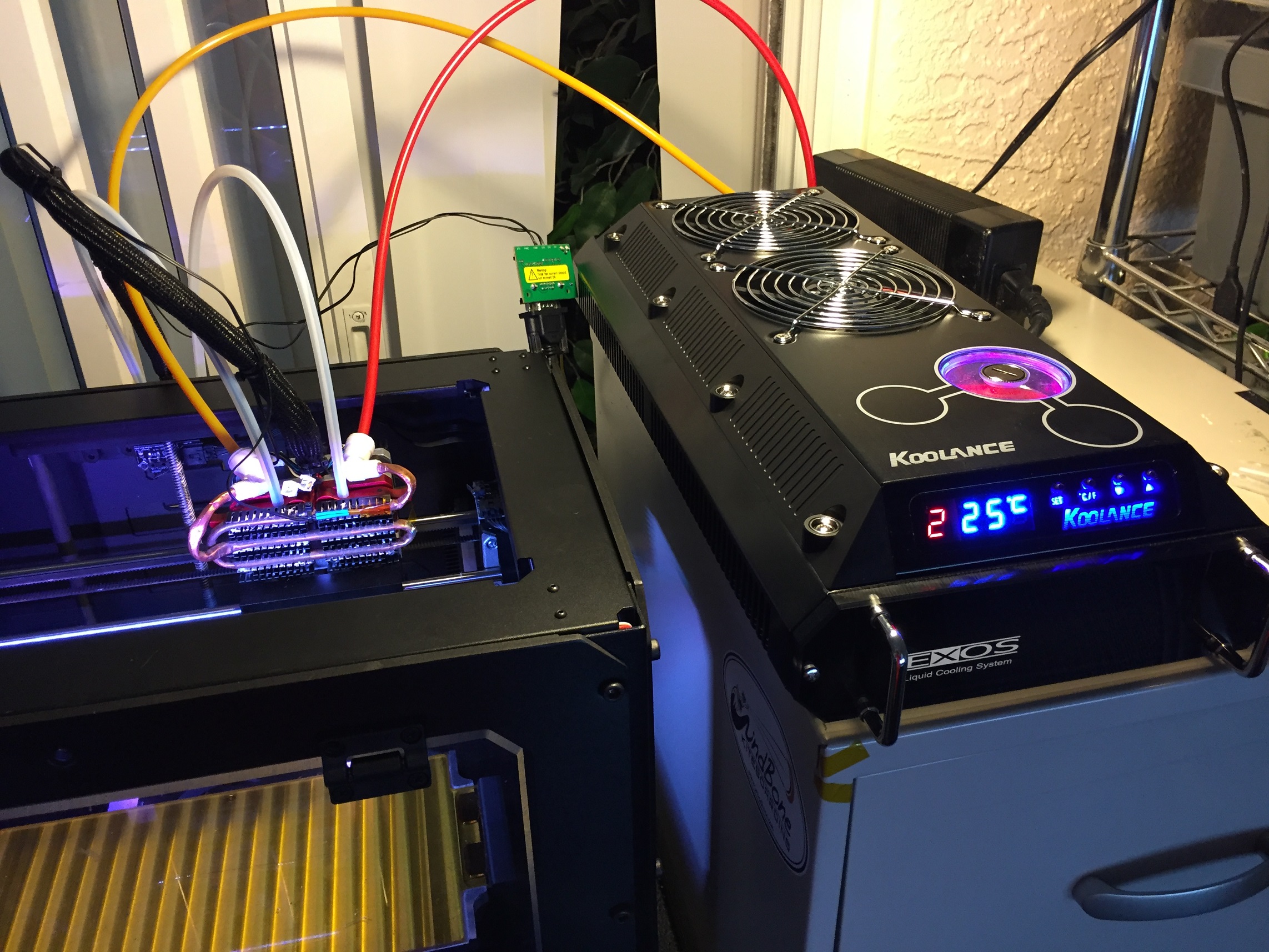 Conclusion, it worked awesome! First successful dual print in years. The mounting bar stabilized around 45degC. I melted two cold packs in the process (5 hours). This was a prototype, an adapted CPU water cooling reservoir, pump and radiator will work just fine.