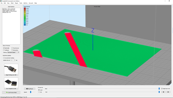 Hi all, a very simple print is showing an odd error. It’s simply a rectangular plate, 3mm thick, with two holes near one shorter edge. It’s not a complex mesh, according to netfabb and makeprintable and any other checker I can throw at it, it’s got no errors. When printed, on the final top layer, the printer appears to simply “forget” to finish a couple of sections (see image - I haven’t used a photo 'cos it’s virtually impossible to see). This is a screenshot of the final layer in Simplify, which shows that the layer should be complete and even.