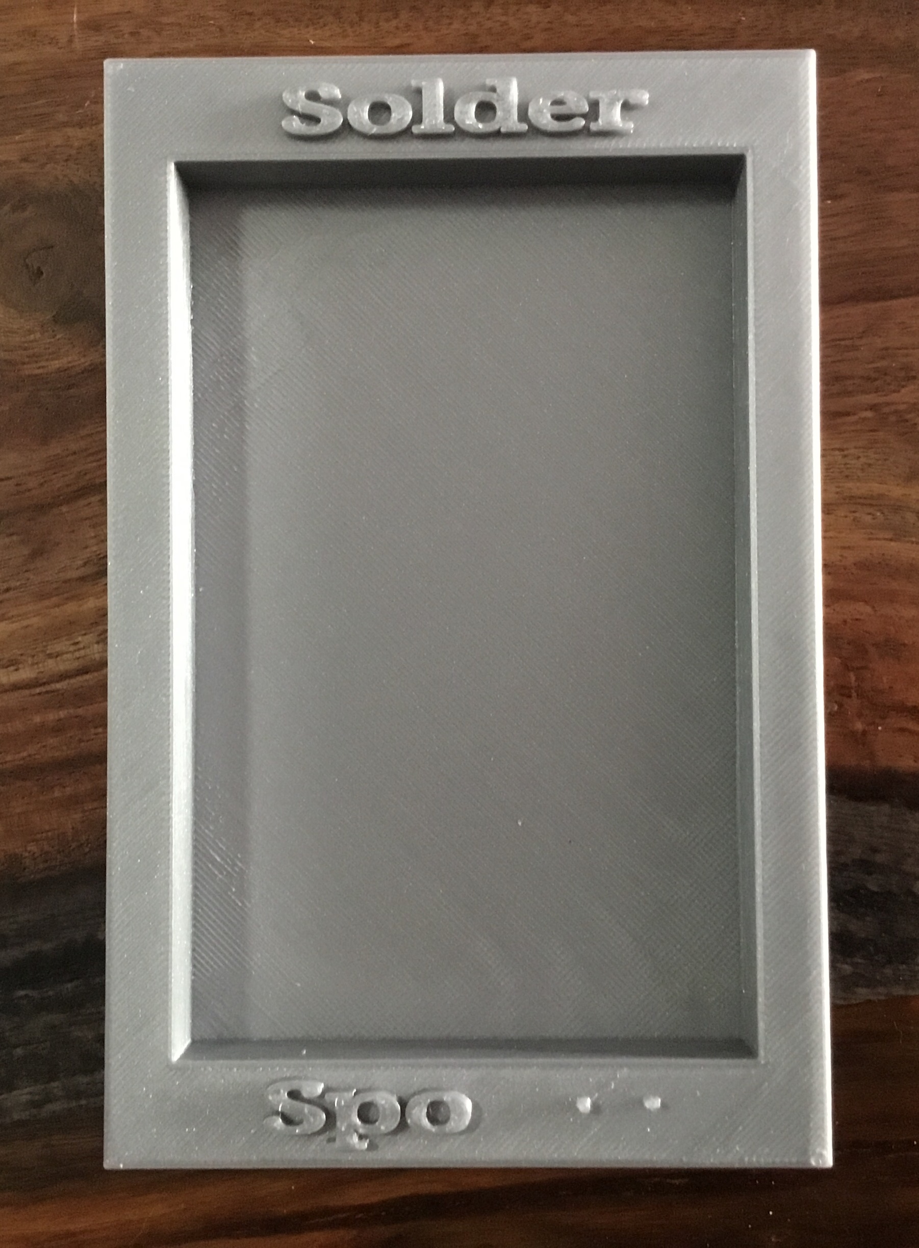 I used tinkercad and the file looks right. I used the text icon to first create “Sponge” then duplicated it to create “Solder”.