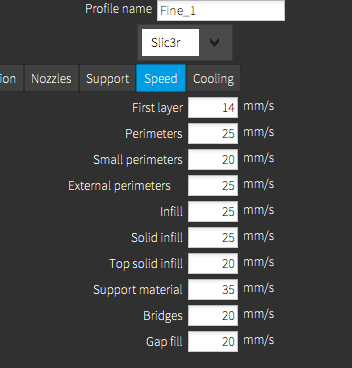 Got it. CelRobox has 3 preset speed profiles: Default, Slic3r, Cura. In advance mode you can make your own profile. When printing, you still can adjust the printingspeed (from half to double) factor as mentioned earlier.