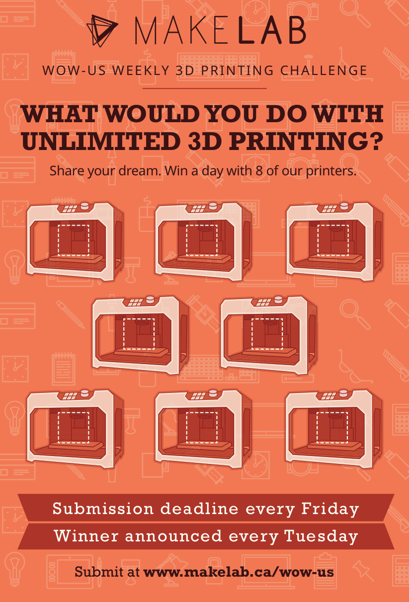 We’ve just launched the ultimate all-you-can-3D print competition! The MakeLab Wow-Us 3D Printing Challenge is asking you what crazy, beautiful, jaw dropping things you would print if you had therun of our eight MakerBot Replicator 2 3D printers for an entire day. Submit a designed, downloaded or remixed 3D project along with an artistic statement (serious or silly). We choose a design each week, and grant access to our entire fleet for 8 hours. Totally free of charge, unlimited white PLA filament included.